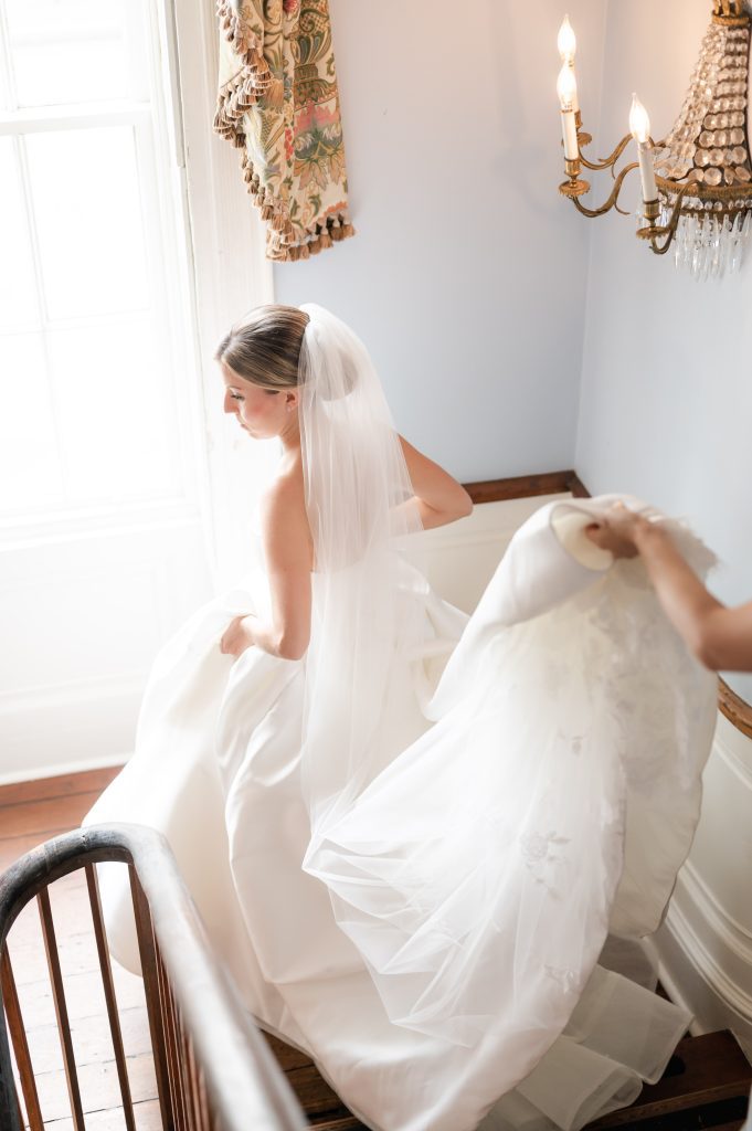 Right in downtown Charleston sits the William Aiken House. It’s old-world elegance hits you the moment you walk up. Those Greek Revival columns and all that intricate ironwork are just stunning. What makes this place special for photos is how many different looks you can get without leaving the property. We can do formal portraits in those grand interior rooms with crystal chandeliers. Then step outside to the courtyard for something completely different. That dramatic staircase for bridal portraits is a chef’s kiss. And since we’re downtown, we can always sneak out for a few quick shots on Charleston’s iconic cobblestone streets if we have time.